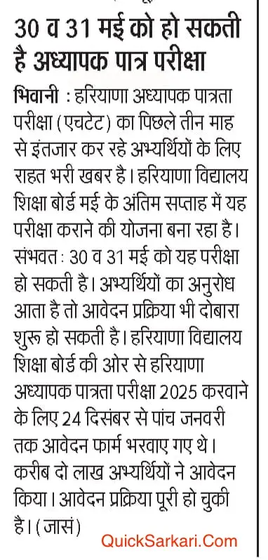 HTET 2026 exam is expected to be held on 30 and 31 May 2026 (tentative).